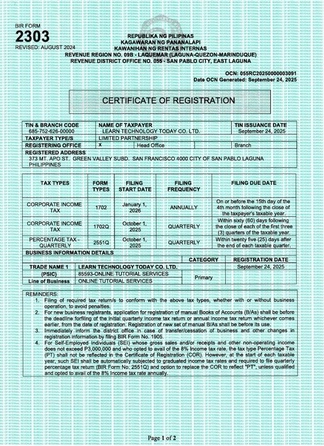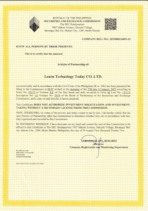 Learn Technology Today is duly registered to the Philippine Securities and Exchange Commission under Educational Support. A proof of our sincere commitment in bringing technology to all who want to learn. The certificates issued by Learn Computer Today are valid and can be used for Job Applications and others.  You can verify our SEC Registration by clicking the button below and type in our name Learn Technology Today or SEC number.